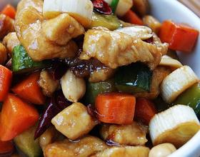 - 5. 锅置火上油烧至3成热,下入腌好的鸡丁迅速滑散;待鸡肉呈白色,捞出沥油。