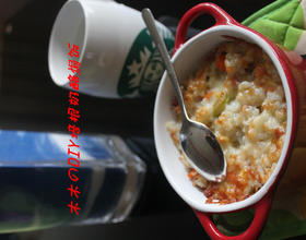 把翻炒均匀的米饭放入烤碗中,米饭上铺上马苏里拉奶酪丝。