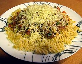 - 11. 把调制好的牛肉红酱浇在螺旋粉上(还没完哈)。