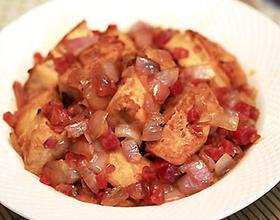 将豆腐推开,将切成粒的洋葱、腊肠下锅炒香