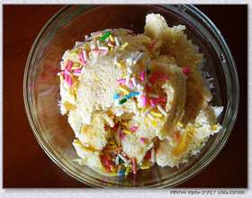 木瓜冰淇淋液倒入食品盒里放入冰箱冷冻室。一小时搅拌一次,共四次,6小时后就可以随时用挖球器挖出来享用了。