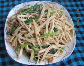 加入千张丝.菠菜翻炒,再加几滴生抽炒一下就出锅了(剁椒里盐比较多,就不在放盐了)。