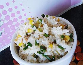 主辅料:米饭、猪肉糜、葱、姜、熟豇豆、熟玉米粒。