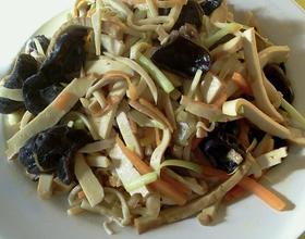 胡蘿蔔,菇,豆干,分別切絲;韭黃切段,黑木耳洗淨,潺水.