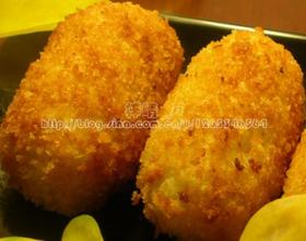 - 4. 将炒好的牛肉馅稍稍放凉,再与土豆泥混合均匀,用手分别将土豆泥团成3cm粗,6cm长的圆柱形