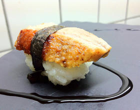 将寿司饭捏成型,将鸭片放在上面,裹上紫菜丝即可。
