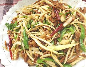 炒熟后放入猪肉炒一炒放盐、胡椒粉、味精拌匀出锅。