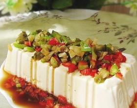 内脂豆腐完整的从盒内倒扣出,将菜末放在上面。