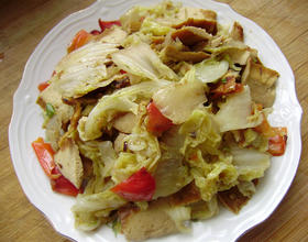 翻炒均匀,将白菜豆干烧熟,最后加入味精调味。