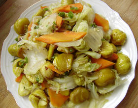 翻炒均匀,倒入板栗翻炒均匀,将白菜板栗烧熟,最后加入味精调味。