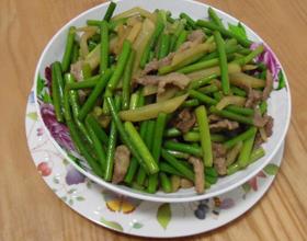 热锅凉油下肉丝炒到肉丝发白下土豆丝,调入适量盐(蒜薹已经用盐腌过,所以这里的盐要少放)和十三香。