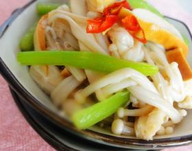 - 5. 将金针菇,芹菜,豆干放入容器中,撒上盐,糖,陈醋和生抽拌匀。