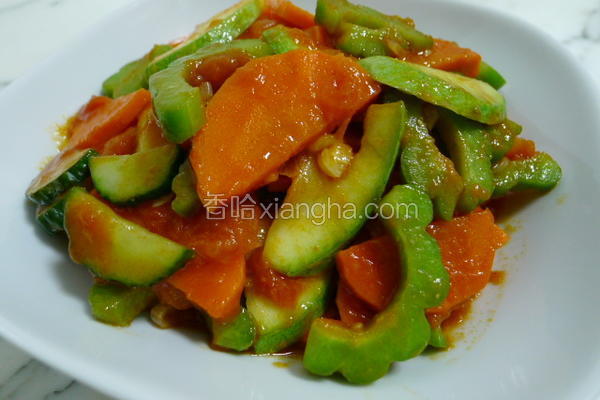 2.西葫芦、黄瓜洗干净切片,胡萝卜洗净去皮切片(焯水2分钟后捞出,过凉水沥水),苦瓜去两头去瓤切片,番茄开水烫后去皮切丁,洋葱头切碎。