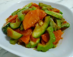 - 2. 西葫芦、黄瓜洗干净切片,胡萝卜洗净去皮切片(焯水2分钟后捞出,过凉水沥水),苦瓜去两头去瓤切片,番茄开水烫后去皮切丁,洋葱头切碎。