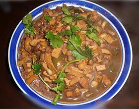 瘦肉切丁,用姜丝,料酒,少量食盐腌制10分钟。