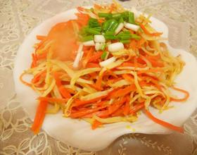 锅烧热,给适量油煸香姜丝,放入胡萝卜丝翻炒至软。