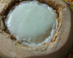 - 4. 把煮好的新鲜椰汁倒入椰子中,放冰箱下层(放冰棒那层)急冻,因为每家的冰箱制冷不同,没有固定时间,待椰汁凝固晃动起来不会流动就可以取出。第一层椰汁冻就做完了