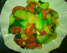 等锅热,把料子倒入锅里,再把青菜到锅里。放耗油,酱油,味精,鸡精,白糖。不放盐,因为耗油和酱油是咸的。