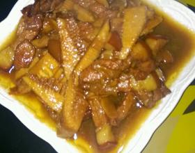 竹笋切筷子般的厚都比较容易入味,红烧前开水煮五分钟一定要的步骤。陈皮泡软用刀刮去白蓉,要不会有点苦。