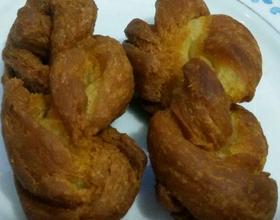 油溫在七成热下入拧好的麻花,浮起捞出。