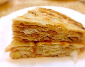 把面团擀成椭圆形(不要太厚),均匀的把肉馅抹在上面,然后左右对称的切三刀不要切断,为了方便大家看清,我在空白的面片上切了一下