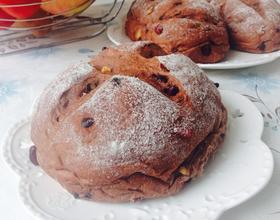 核桃烤熟切碎,蔓越莓提前泡半小时挤干水份,和巧克力豆混合,加入面团揉匀。