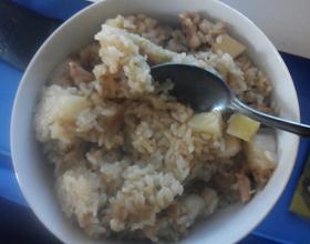 把准备好的食材。倒入电饭锅内。添入水。没过米饭即可。焖至熟。就ok啦!