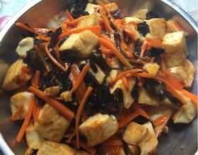 放油爆香蒜头,下红萝卜丝和木耳丝下锅炒,之后放一匙辣豆瓣酱炒均匀,放下豆腐一起炒一下,放芡水,捞一捞就可以上碟了。