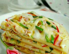 接着铺上青椒和红椒丝,最后把奶酪铺上去,盖上盖子小火闷两分钟,直到到奶酪融化,轻轻晃动锅子,直接装碟。