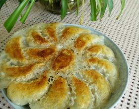 饺子底部形成薄∽的锅巴,金黄色,最后用一个大盘子倒扣在平底锅上翻转即可。