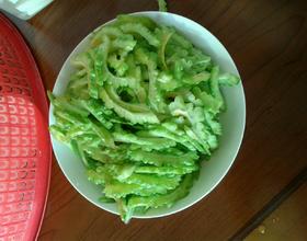苦瓜洗净挖瓢切片,可以泡15分钟盐水,不那么苦!