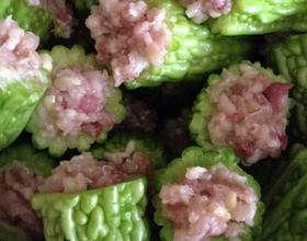 把伴好的肉馅噻进空心的苦瓜里满为止,然后放高压锅里,加些许盐和蚝油,然后太火焖压15分钟左右就可以了!