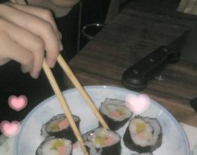 将海苔铺在竹签上,将饭均匀铺在上面,再将黄瓜火腿胡萝卜还有调味萝卜铺上来,铺成一排,再撒些肉松,挤些沙拉酱