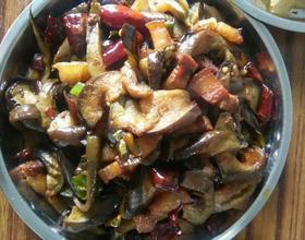 在淹好肉后将整条茄子洗干净:切长条或者切成我这样斜片:切好后撒上少许盐淹30分钟:这样做主要是在少吸油炒而且更入味