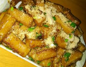 不粘锅入少许油,大火加热,倒入糕粿,老抽,转中小火煎至四面微焦,洒下萝卜干碎翻炒均匀