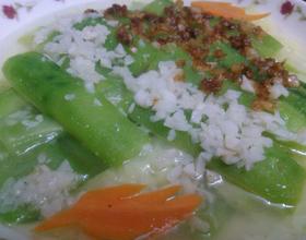 蒜茸一半炸金黄、一半不用炸、分别放到丝瓜各一边。