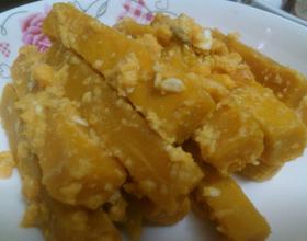 慢火放很少油炒蛋黄碎,加糖炒,加少量水,少量酒烧开。