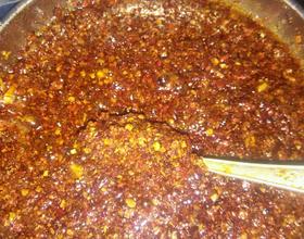 油烧好后立刻关火迅速将油倒入碗中:先倒上一半油:用小勺将碗中辣子面和油拌匀: