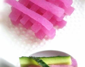 把冬瓜条浸在红色的紫甘蓝液中,放冰箱冷藏。