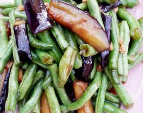 热锅热油下入茄子,炒两秒,下入豆角翻炒片刻。