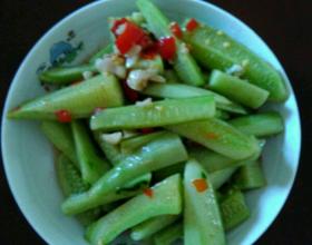 首先把油倒入锅中烧热,把火关掉,把大蒜头,在把洗干净的黄瓜切丁倒入锅中,把盐,胡椒,酱油,耗油,剁椒少许倒入锅中编炒,在起锅