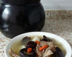 倒入砂煲内 加热水 香菇 红枣 当归 香葱~