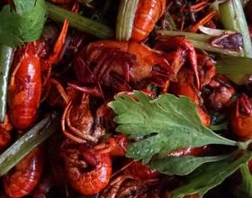 然后锅里放油 把辣椒八角花椒红九九葱姜爆香,加料酒,少加水熬一会出味,加入盐味精,放入洗好的芹菜翻炒半分钟,再放入炸好的龙虾翻炒,两分钟后虾入味即可,放入拍好的大蒜翻几下闷一会入味,起锅即可!