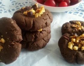 烤箱提前预热五分钟,把数个可可曲奇饼加上适量坚果,码上烤盘入烤箱进行烤制