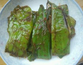 如图所示:青椒一面煎至虎皮状,翻过来煎另外一面,也煎至虎皮状;