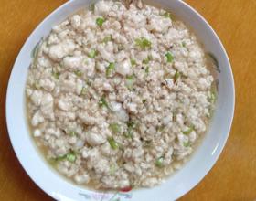 将白玉豆腐缓慢放入锅中,防止油飞溅烫伤,用锅铲将豆腐切碎。