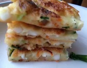 鱿鱼,胡萝卜,韭菜切碎。拌入面粉,加一个鸡蛋,盐少许,牛奶少许,水少许