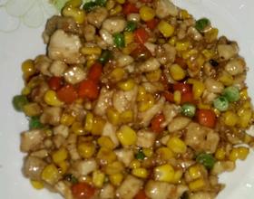 炒玉米粒等,然后加水至水沸,放入酱油,一勺糖,料酒,放入鸡肉翻炒