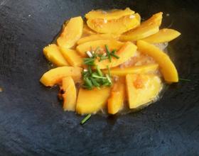 感觉南瓜绵软了,放盐翻炒,加葱花再焖一下