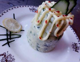 - 10. 将切好的蛋白颗粒和黄瓜颗粒倒入土豆泥,拌匀